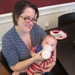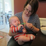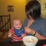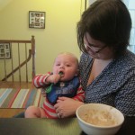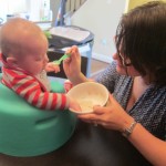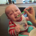 Colin’s been downing bottles like it’s his job (well, we guess that is part of it) and staring at our food when we eat in front of him, so it was time to introduce solid foods. Just like his first bath, it started out okay, but then ended in disaster with all-out crying and real tears.