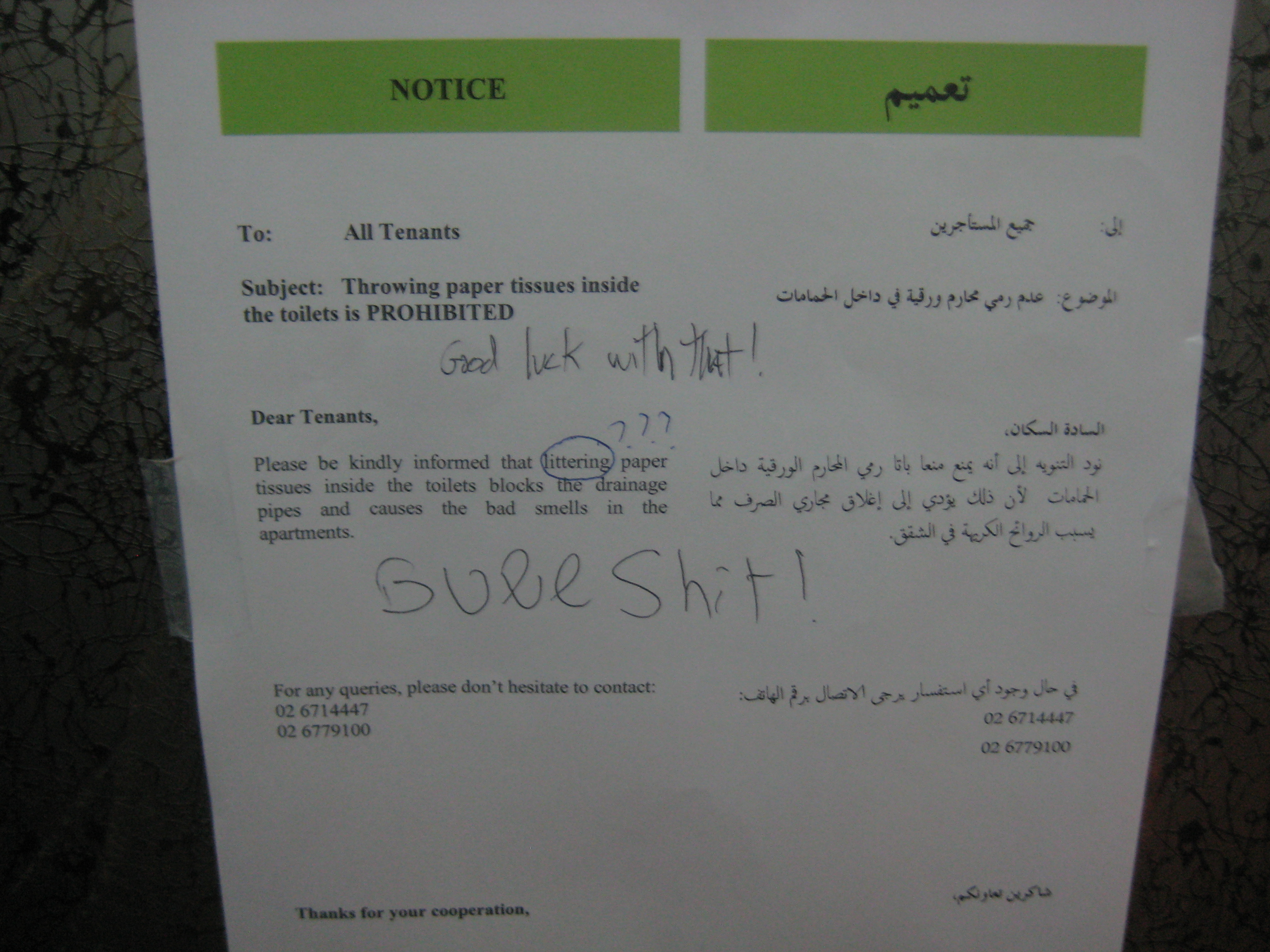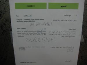 Every once in a while, we run across something in the UAE that reminds us it is still a developing nation. Here is a sign that was recently posted in one of our apartment elevators by management.